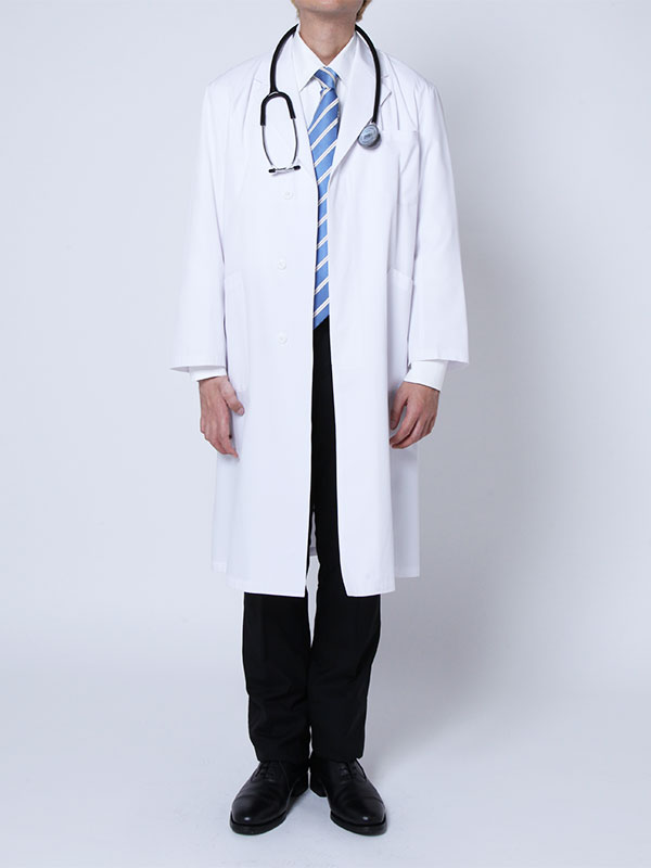 白衣の中に長袖ホワイトシャツとブラックパンツを合わせた医者のコーディネート例です。