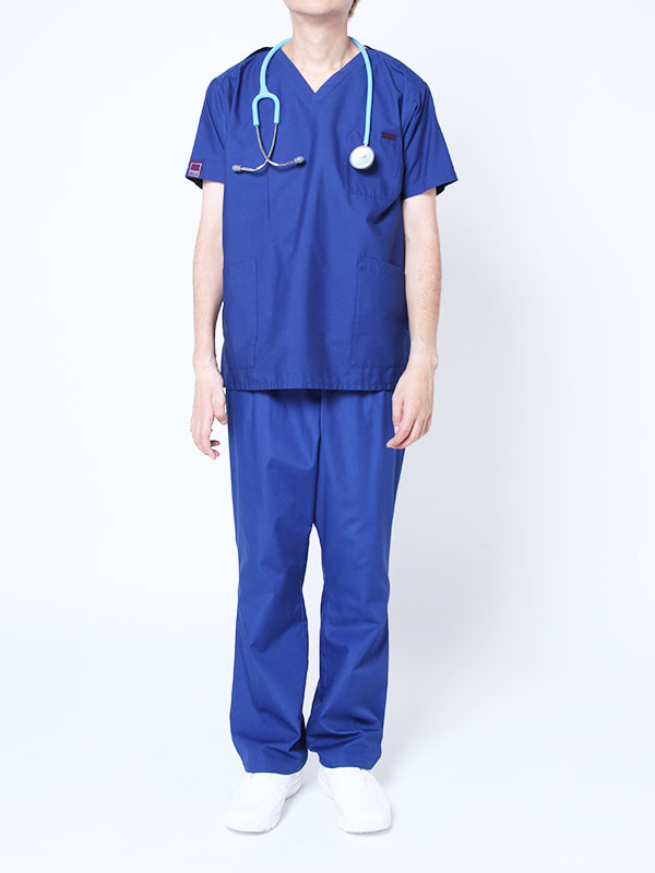 ブルーの医療着シャツ(パンツ付き)と補聴器の手術着コーディネート例です。