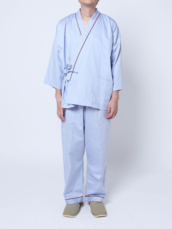 ブルーの医療着シャツと医療着パンツの患者着コーディネート例です。