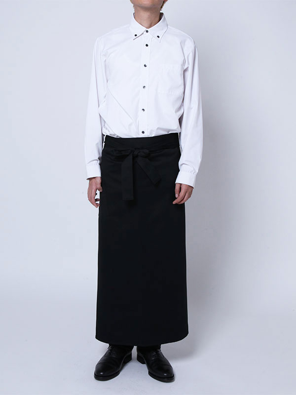 ホワイトの長袖シャツとパンツ、ブラックのエプロンのウェイトレス・ウェイターコーディネート例です。