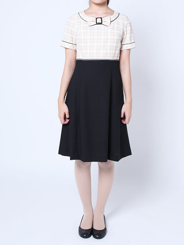 ブラウンのワンピースとブラックのシューズのエステティシャンコーディネート例です。