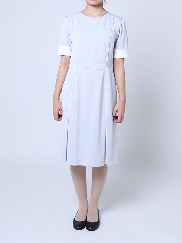 ブルーのワンピースとブラックのシューズのエステティシャンコーディネート例です。
