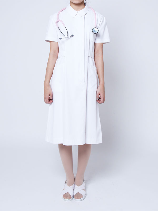 ホワイトの医療着ワンピースのナースコーディネート例です。